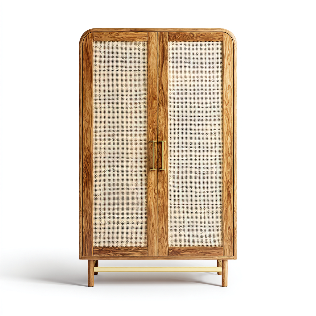 La struttura è realizzata in legno massello con finitura naturale che mette in risalto le venature originali. Le ante sono arricchite da pannelli intrecciati in fibra naturale, pensati per favorire la traspirazione e conferire un aspetto caldo e artigianale. Le maniglie metalliche completano l'insieme con un tocco discreto.