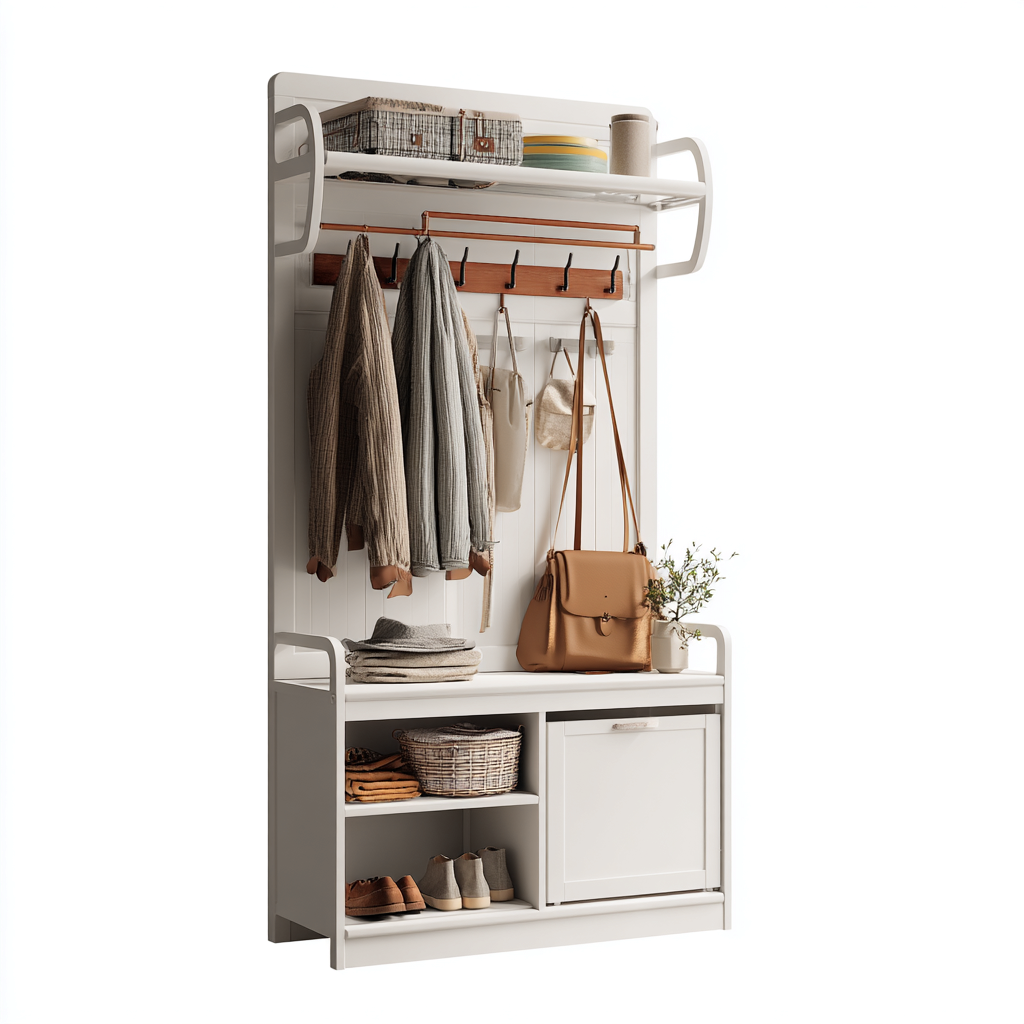 Questo attaccapanni da ingresso dal design verticale combina zona appendiabiti, mensola superiore e spazio contenitore inferiore in un'unica struttura funzionale. Ideale per organizzare giacche, borse e accessori all'ingresso di casa, aiuta a mantenere l'ambiente ordinato e accogliente.
