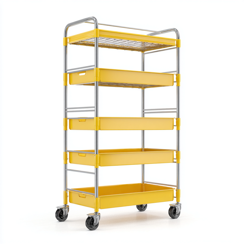 Il telaio è realizzato in metallo con finitura color argento, abbinato a vassoi e ripiani in metallo verniciato giallo. I materiali garantiscono robustezza, stabilità e una buona resistenza all'uso quotidiano.