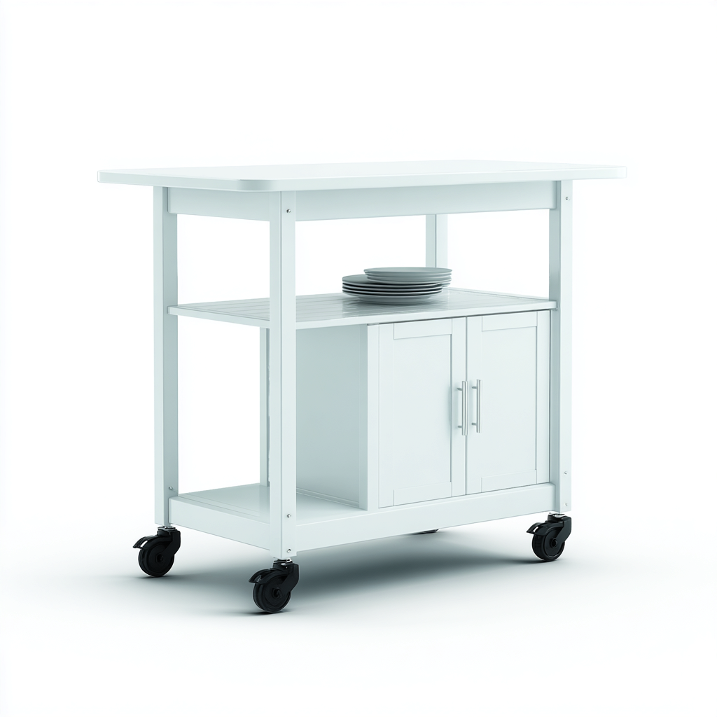 La struttura è realizzata in metallo verniciato bianco con finitura uniforme. Il piano superiore solido garantisce resistenza all'uso quotidiano e facilità di pulizia, mantenendo un aspetto ordinato e luminoso.