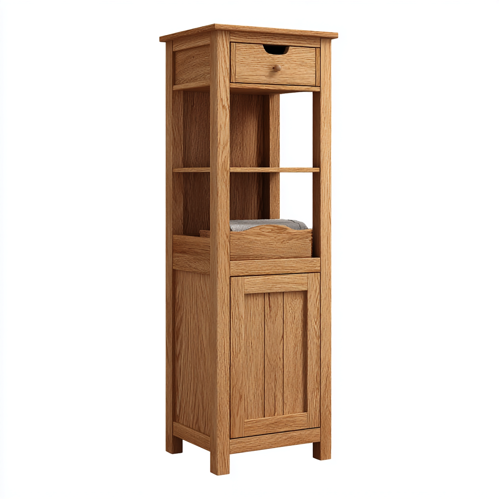 Il mobile offre vani interni accessibili e una superficie superiore utile per piccoli oggetti. La configurazione verticale aiuta a sfruttare lo spazio in altezza mantenendo l'area bagno ordinata.