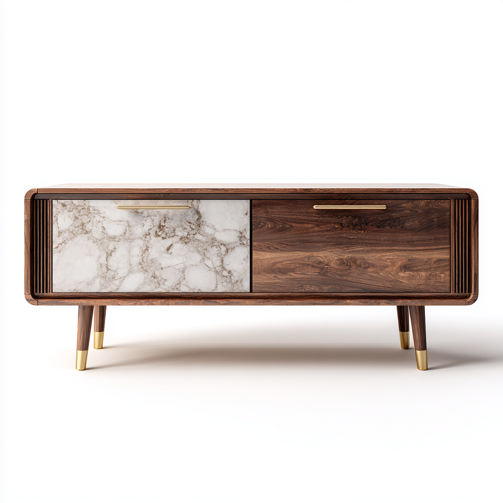 La struttura è realizzata in legno con finitura marrone scuro, abbinata a pannelli frontali con effetto marmo di colore bianco. I dettagli metallici dorati sui piedini e sulle maniglie valorizzano l'estetica complessiva del mobile.
