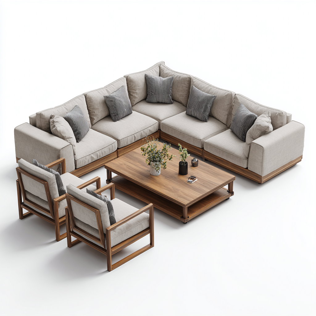 Questo set divani modulare ad angolo è progettato per creare una zona living ampia e funzionale, ideale per il soggiorno moderno. La configurazione a L consente di sfruttare al meglio lo spazio, offrendo una disposizione armoniosa e accogliente per momenti di relax e convivialità.